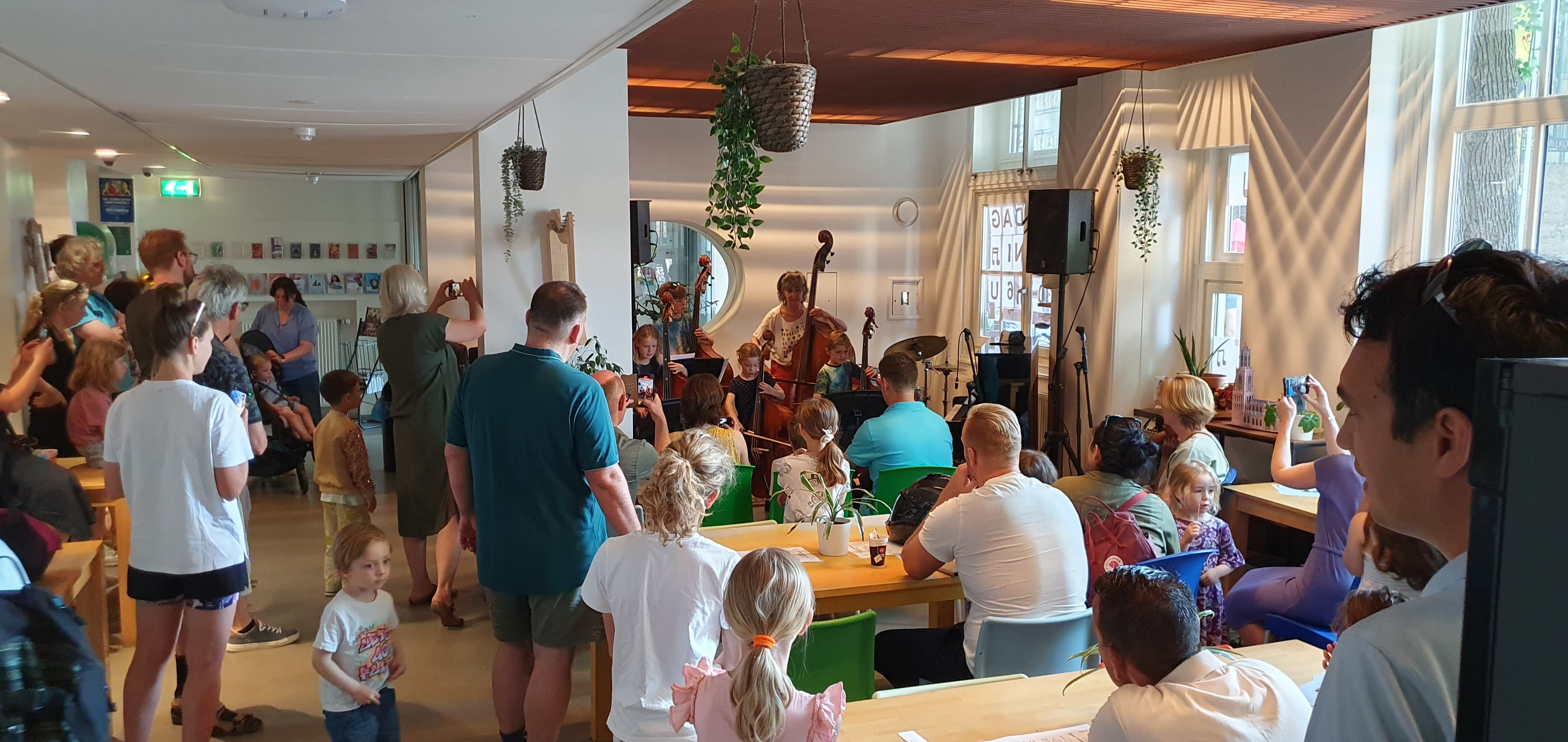Ook was er livemuziek van leerlingen en docenten te horen in de foyer, van o.a. Mari-Anne Hof‘s Ukelele Groep, Tegenpool Orkest en Dr Loevenhout & Consorten, wat voor een levendige sfeer zorgde in het pand aan het zonovergoten Domplein.